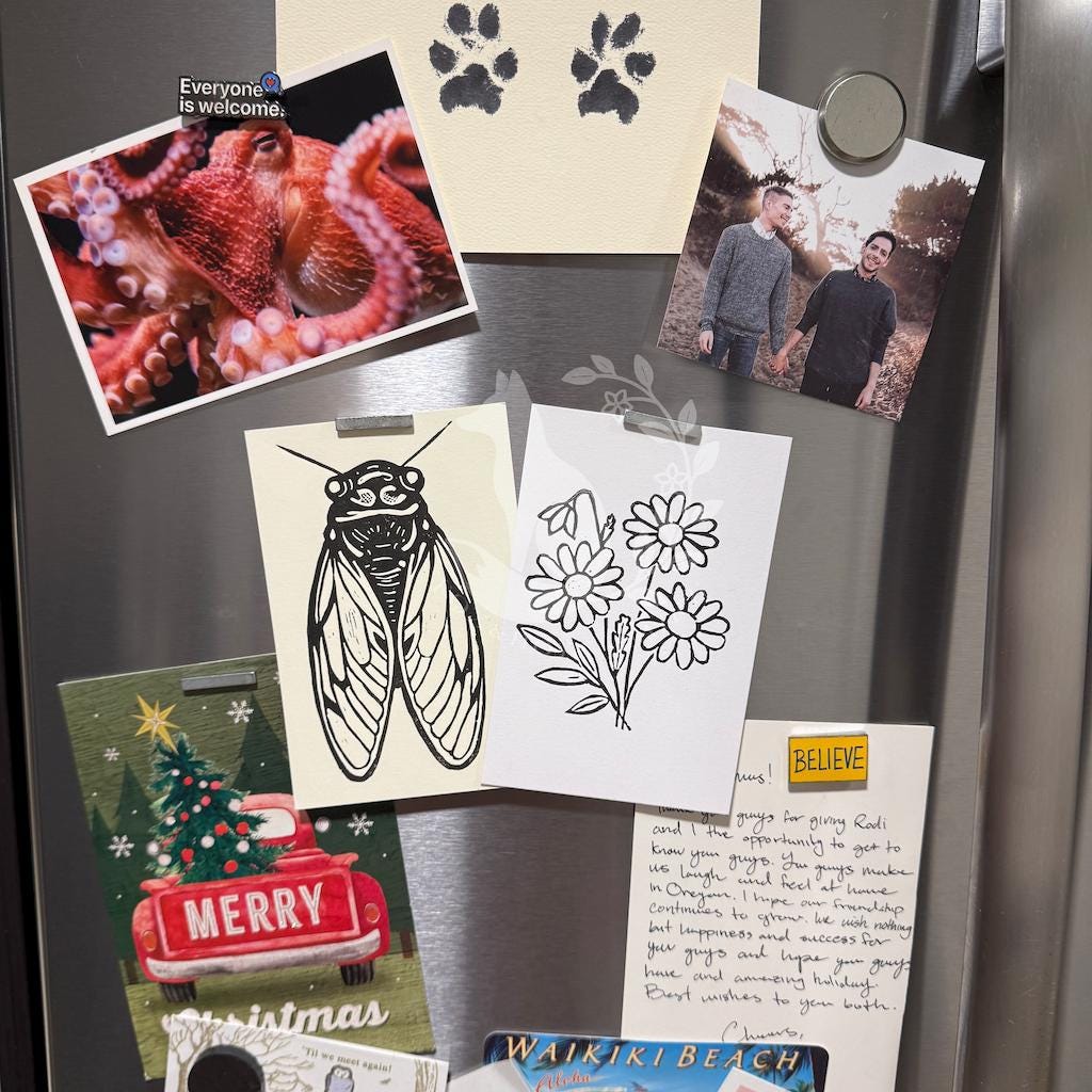 Our greeting cards are artisanal treasures, each hand-cut and individually folded, complete with its own envelope and enclosed in a protective plastic sleeve. These cards are printed on high-quality cardstock and are intended to be both a functional piece of mail and a small collectible print. The interior of every card is left blank, so you can choose your favorite design and personalize your message for any occasion, be it a heartfelt thank you, a joyful celebration, or just to say hello. The designs are carved into linoleum blocks and printed in rich, oil-based ink, then left to cure over several days resulting in a tactile, character-rich impression.Subtle ink variations and slight edge irregularities are embraced as authentic signs of hand-crafted quality. Approximately 4″ × 6″ when folded, 8″ × 6″ when open