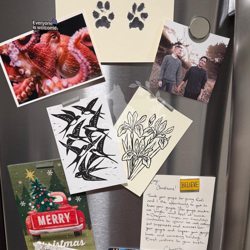 Our postcards are hand-cut, complete with its own envelope and enclosed in a protective plastic sleeve. These postcards are printed on high-quality cardstock and are intended to be both a functional piece of mail and a small collectible print. The back of every postcard is left blank, so you can choose your favorite design and personalize your message for any occasion, be it a heartfelt thank you, a joyful celebration, or just to say hello. The designs are carved into linoleum blocks and printed in rich, oil-based ink, then left to cure over several days resulting in a tactile, character-rich impression.Subtle ink variations and slight edge irregularities are embraced as authentic signs of hand-crafted quality. Approximately 4″ × 6″ in size